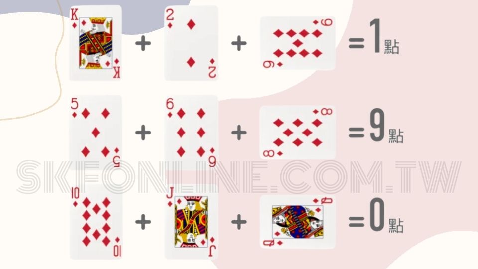 計算贏家:比較莊家和閒家的手牌總和,接近9的一方獲勝。平局時,下注的錢將被退還。