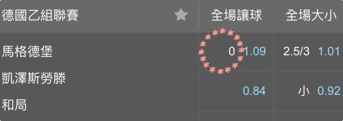一、押注讓「0」球:代表互不相讓,贏1球以上全贏。這裡與獨贏盤不同的是,若和局則不算輸贏退還賭注。