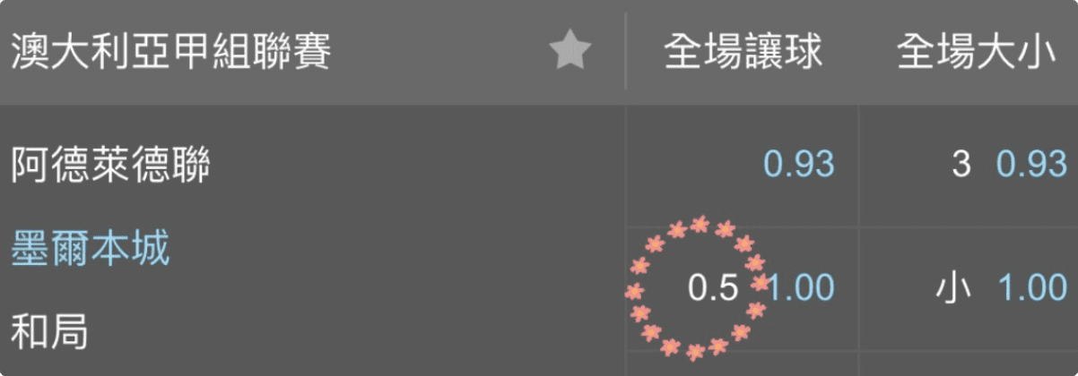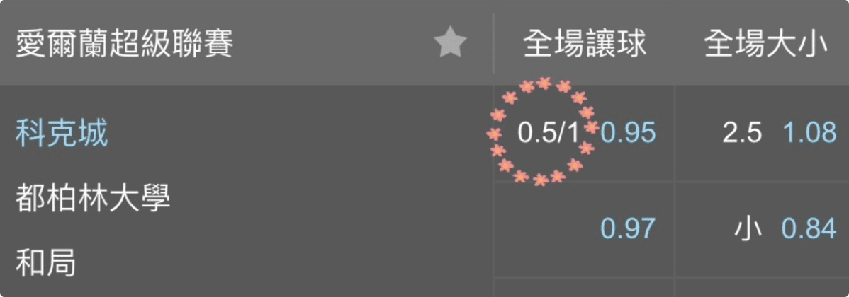 二、押注讓「0/0.5」球:代表讓分隊與受讓隊進球數相同時,買讓分隊輸50%;若讓分隊贏1球以上則全贏。
