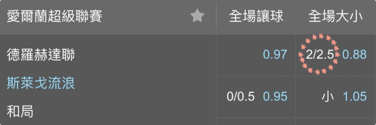 三、押注「2.5大」:表示雙方總進球數2球時,押大全輸;總進球數3球以上則全贏。