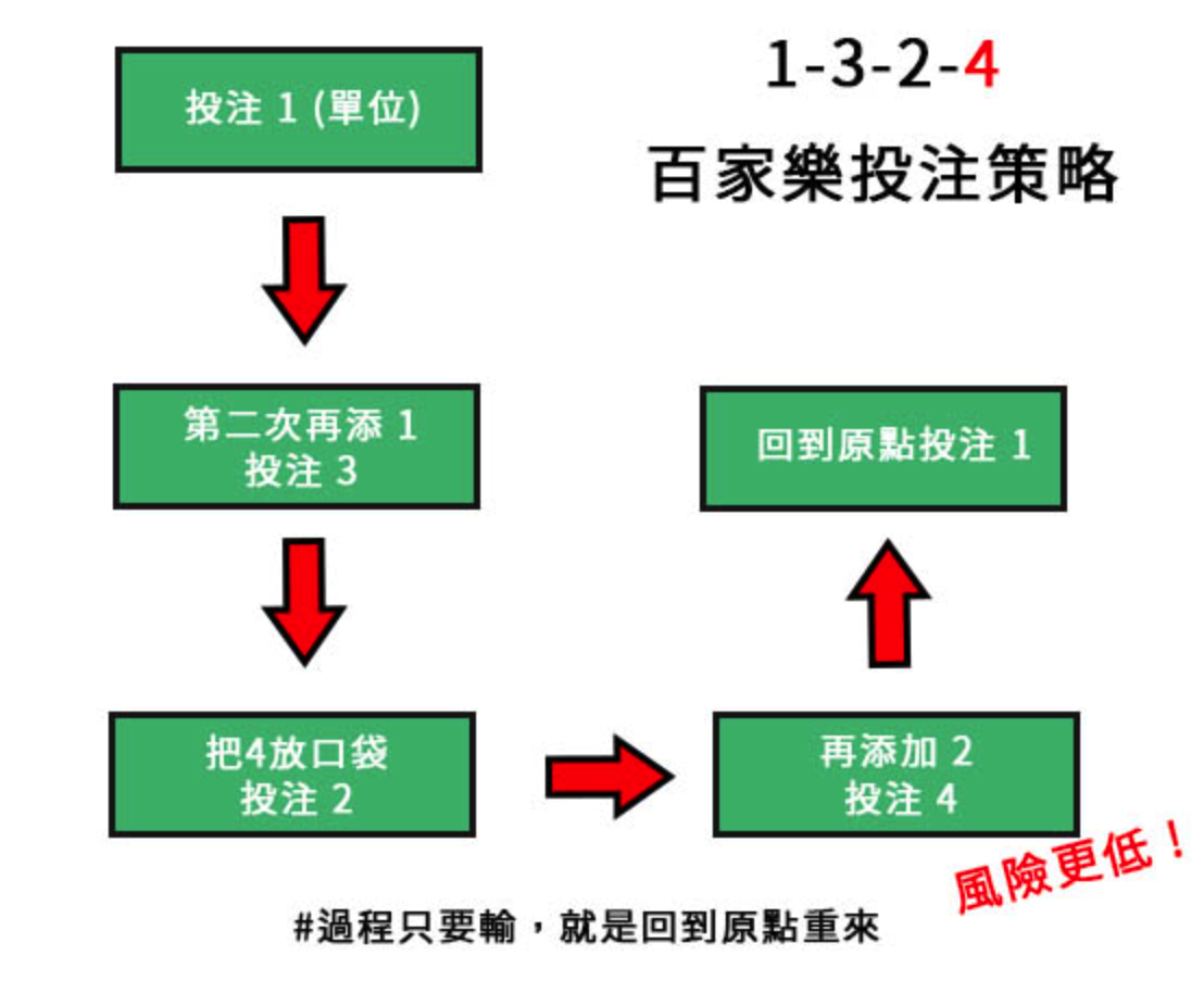 而百家樂1-3-2-4投注法是其變化版本,唯一不同的是最後一個步驟。