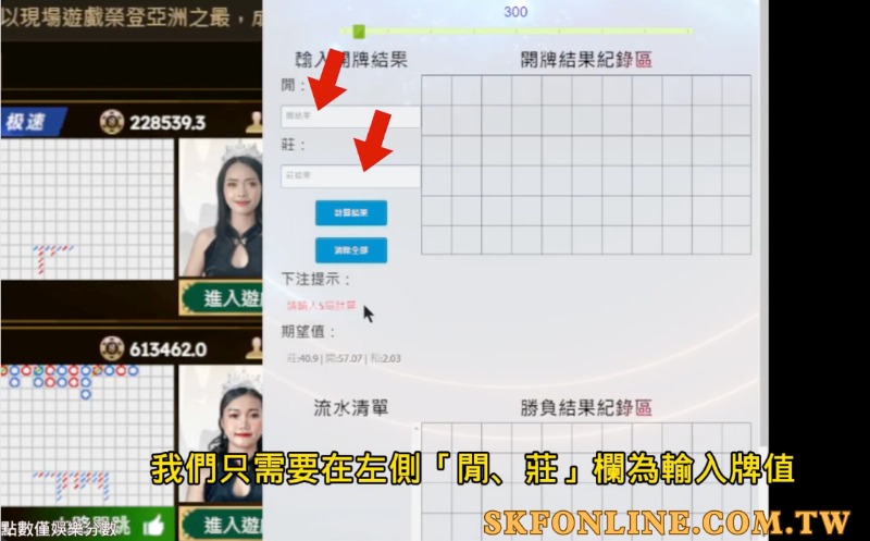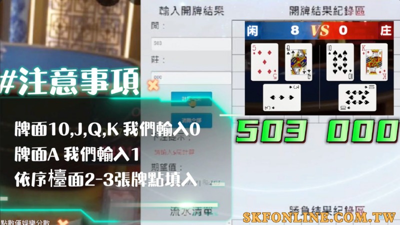 在遊戲進行時,您需要關注「閒」和「莊」兩個欄位的牌值計算結果。當您看到一局牌局結束後,只需將牌值輸入到程式的相應欄位中。