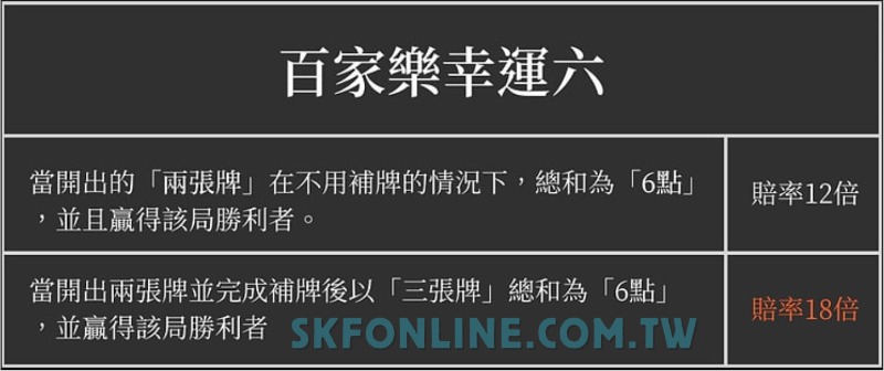 百家樂幸運6是一種特殊的玩法。在百家樂中,除了一般的投注方式外,還有一種稱為「百家樂Super 6」或簡稱為「幸運6」的玩法。這種玩法是指投注莊家和閒家的點數,經過加總後得到6點。然而,由於百家樂幸運6的機率相對較低,因此並不是所有玩家都會選擇以此為長期投注策略。