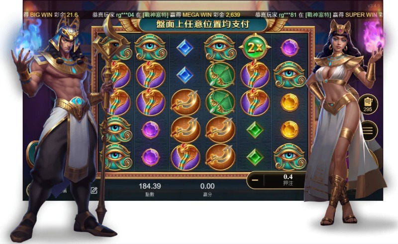 戰神賽特的最大亮點之一在於其創新的無賠付線設計,讓玩家不需拘泥於傳統的賠付線組合即可贏取獎金。當轉輪上出現4到6個寶藏符號時,玩家將觸發免遊。在戰神賽特中,玩家的獎金是根據中獎符號的數量和類型來計算的。中獎後,對應的符號會自動消除,並由新符號補滿盤面,直到不再有中獎組合為止,極大提高了玩家連續中獎的機會。