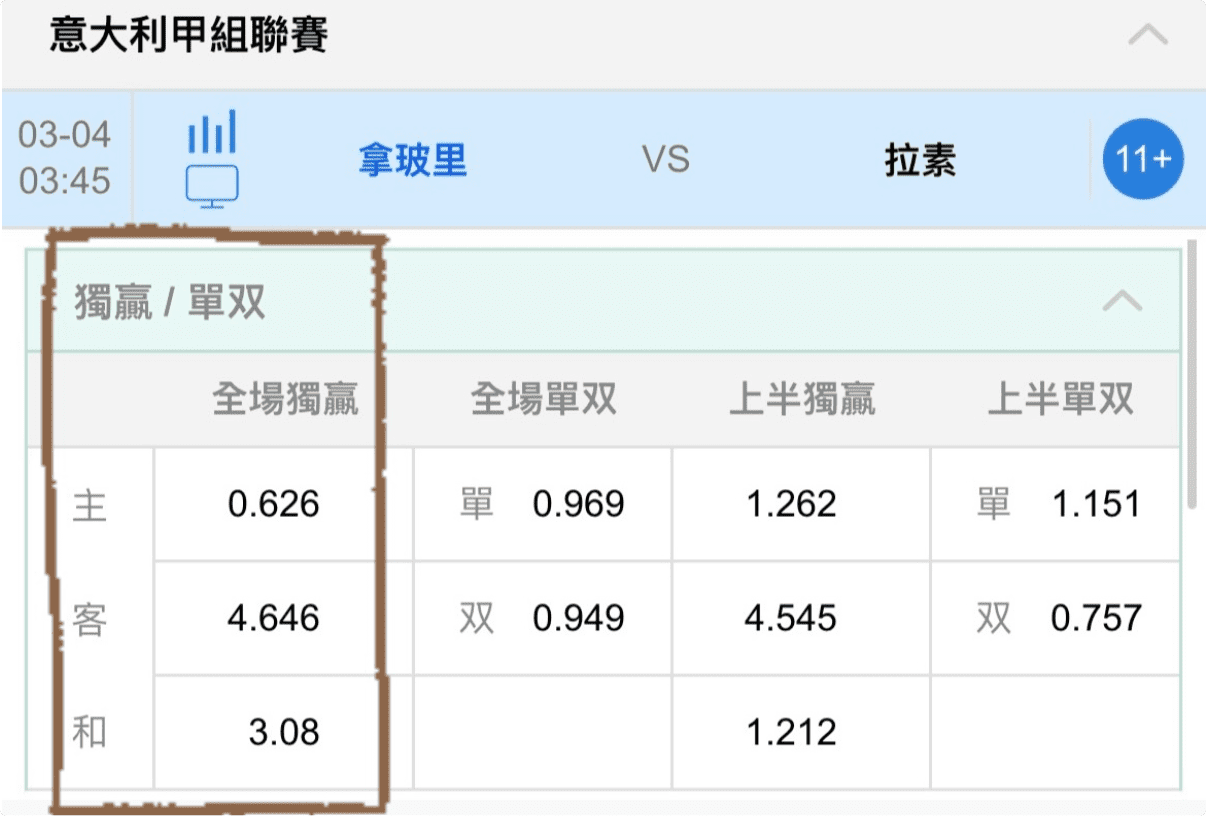 獨贏盤可以說是最單純的盤口,因為沒有讓分,單看哪隊的進球數多就贏,也因此獨贏盤的雙方賠率通常差距很大。