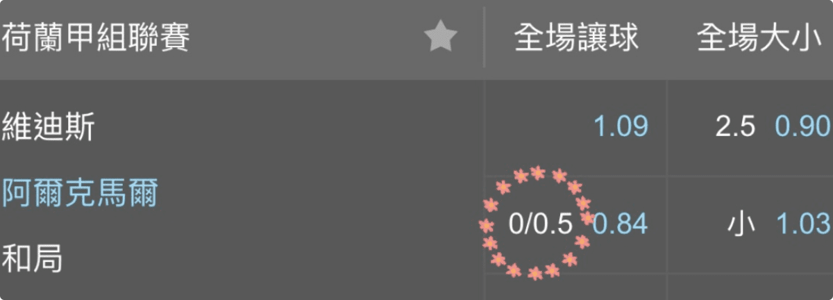 二、押注讓「0/0.5」球:代表讓分隊與受讓隊進球數相同時,買讓分隊輸50%;若讓分隊贏1球以上則全贏。
