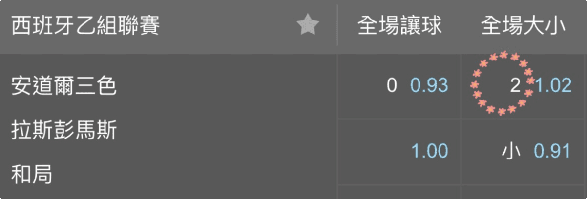 押注讓「2」球時:代表讓分隊贏3球以上全贏;若讓分隊贏2球代表和局;若讓分隊贏1球則算輸。