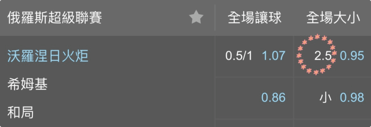 三、押注「2.5大」:表示雙方總進球數2球時,押大全輸;總進球數3球以上則全贏。