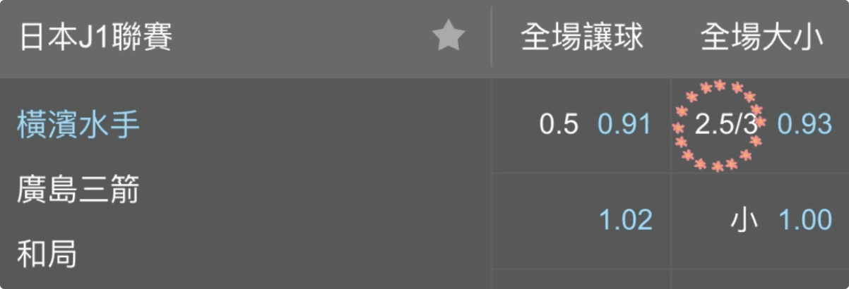 二、押注「2/2.5大」:表示雙方總進球數2球時,押大輸50%;總進球數3球以上則全贏。