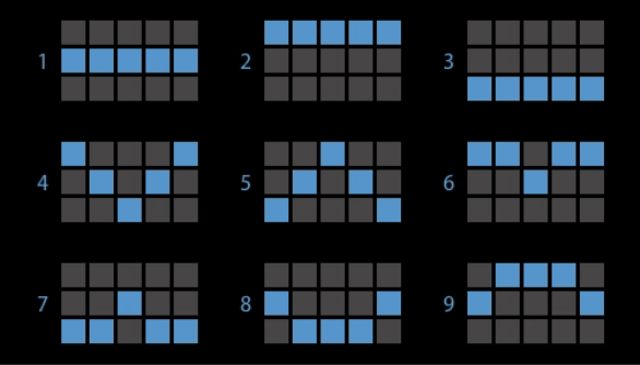 在此9條路徑上的任一條達成圖示連線以下簡稱連線,均可獲得獎勵。