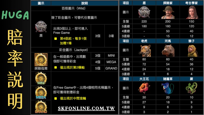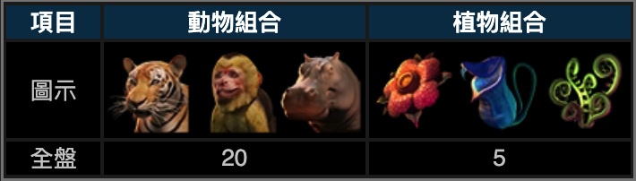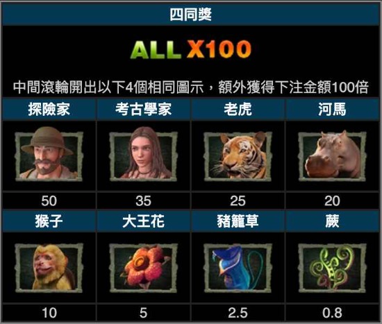 中間滾輪圖示與外圍跑燈圖示相同,即達中獎條件並獲得圖示倍數,如下表。