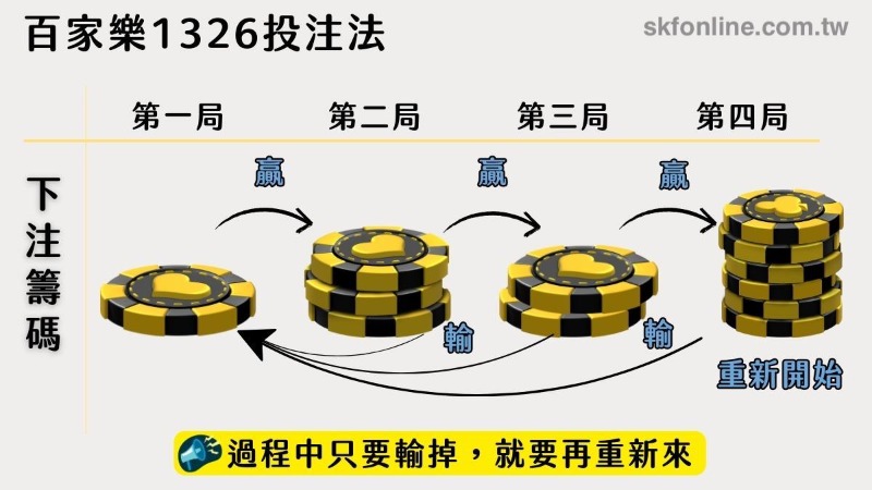 1326是一種有趣且相對穩健的百家樂下注方法。它的原理相對簡單,讓玩家在一連串的勝利中能夠快速增加獲利,同時在失敗時也能夠降低損失。